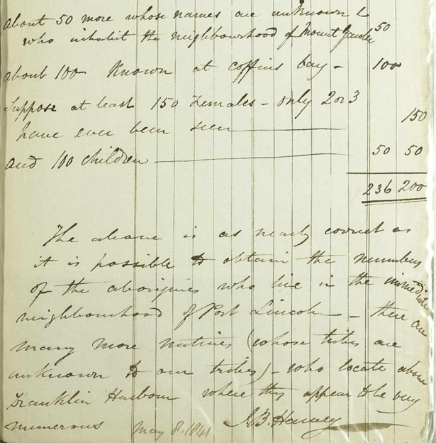 The above is as nearly correct as it is possible to obtain the numbers of the aborigines who live in the immediate neighbourhood of Port Lincoln – there are many more natives (whose tribes are unknown to our tribes) – who locate above Franklin Harbour where they appear to be very numerous. J. B. Harvey, May 08, 1841.