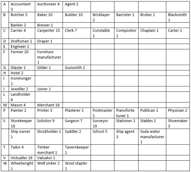 The occupations found in the 1839 directory are listed in the table below.